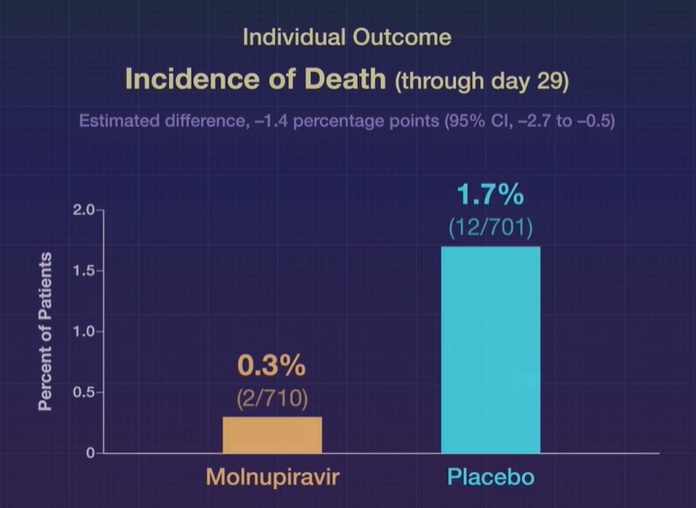 Insgesamt wurden 1433 Teilnehmer randomisiert; 716 erhielten Molnupiravir und 717 ein Placebo. Mit Ausnahme eines Ungleichgewichts beim Geschlecht waren die Ausgangsmerkmale in beiden Gruppen ähnlich.